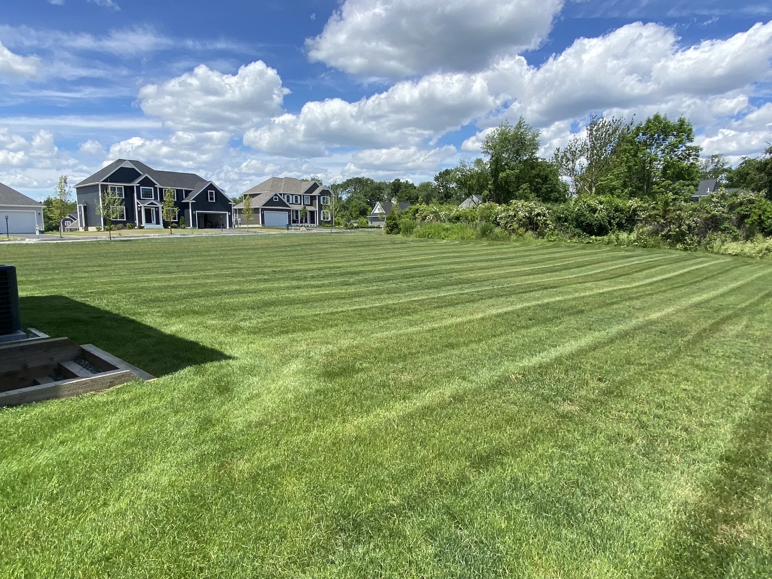 Freshly mowed lawn in a suburban neighborhood with houses, a clear blue sky, and clouds.