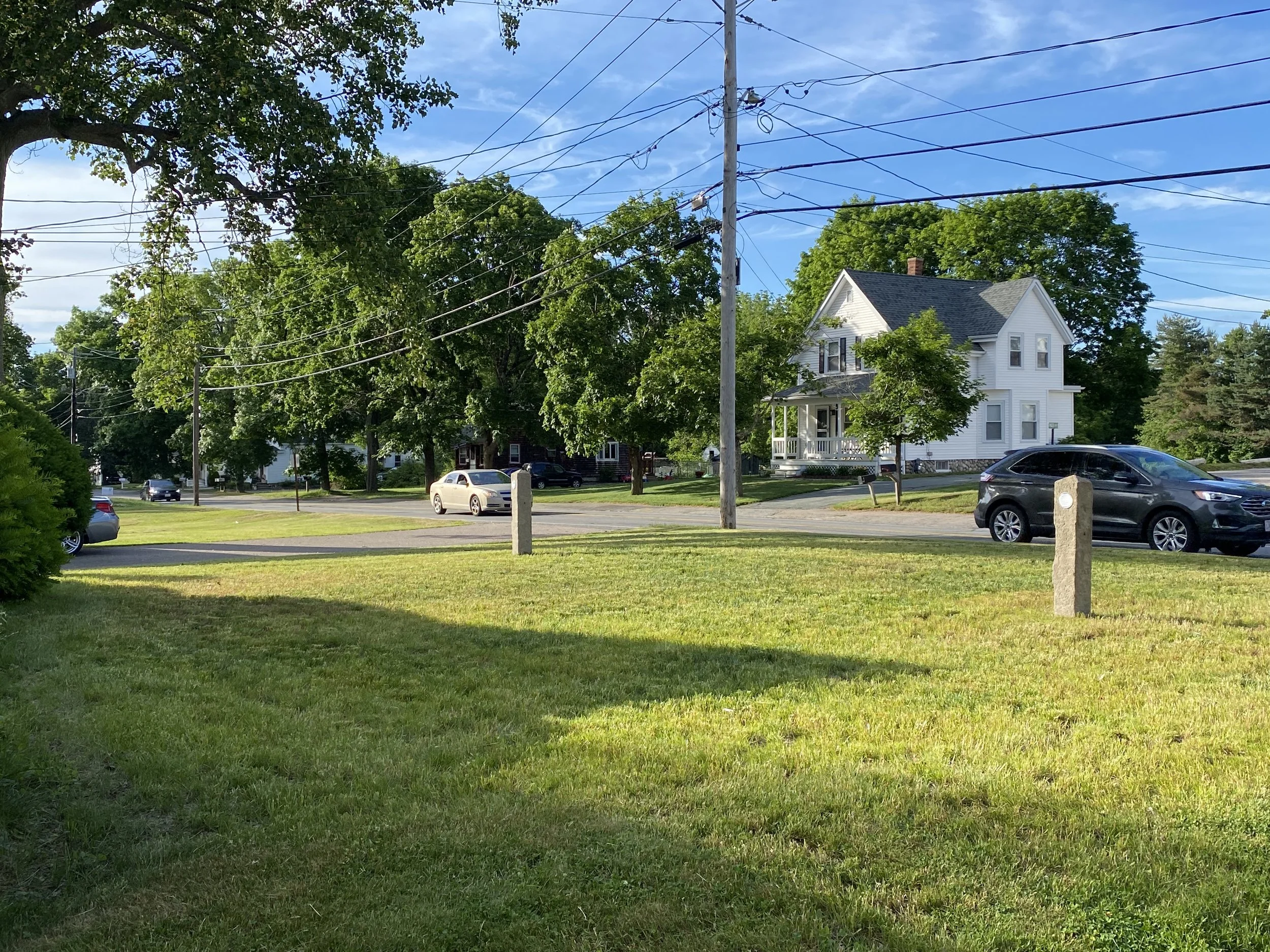 Lush green lawn with a stone marker, surrounded by trees and utility poles, adjacent to a road with cars in the distance.