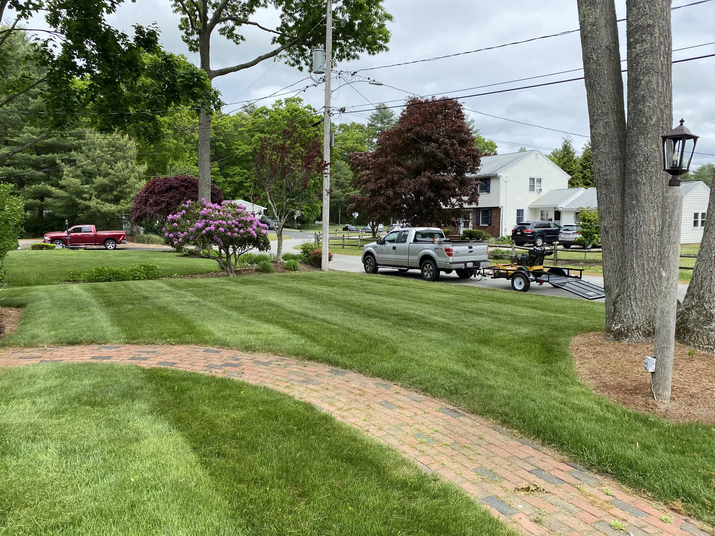 Residential neighborhood with green lawns, trees, and parked pickup trucks. A brick pathway curves through the grass, and a truck with a trailer is visible on the street.