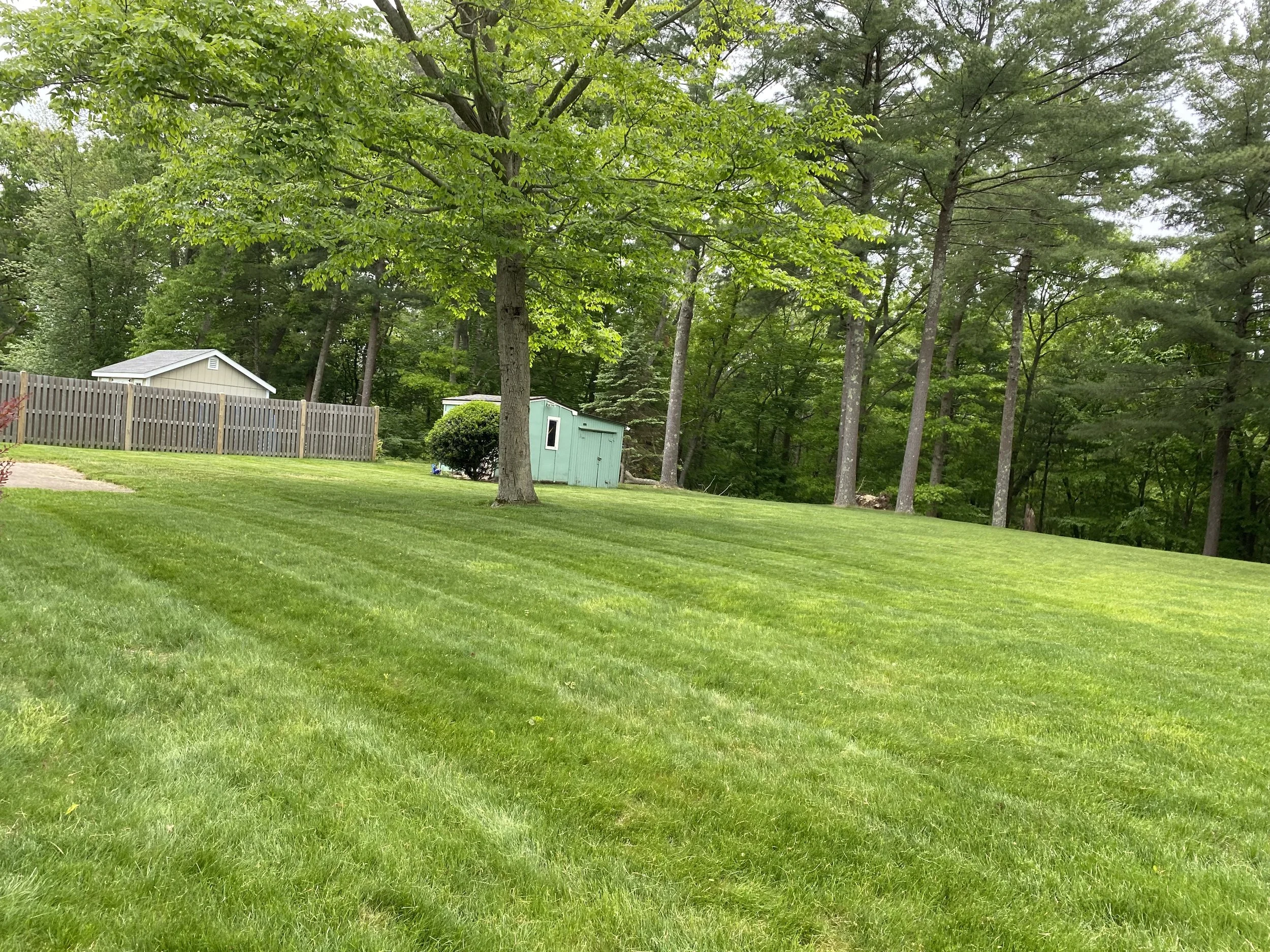 A large grassy lawn with a tree and a small green shed in the background surrounded by a wooden fence and tall trees.