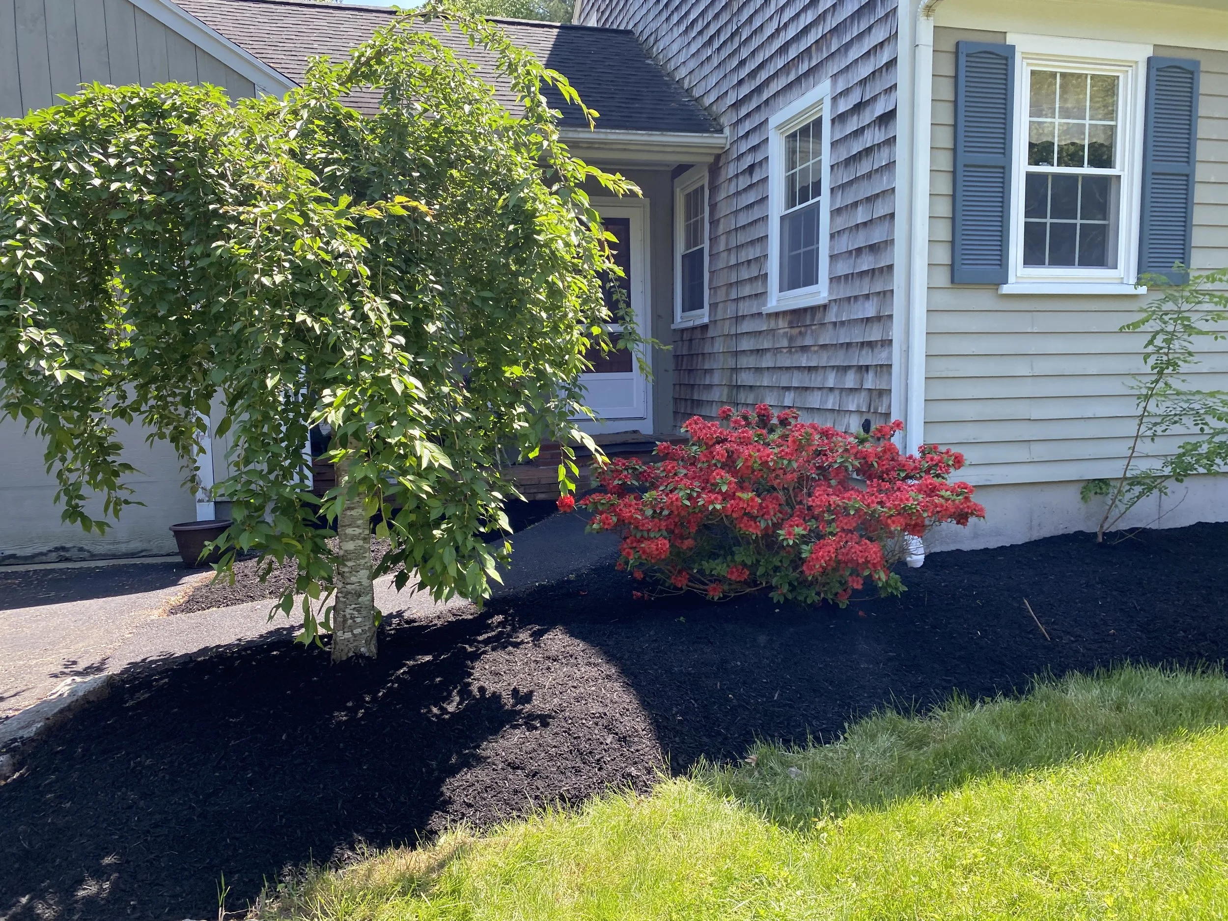 Landscape with black mulch, shrubs, and blue siding.