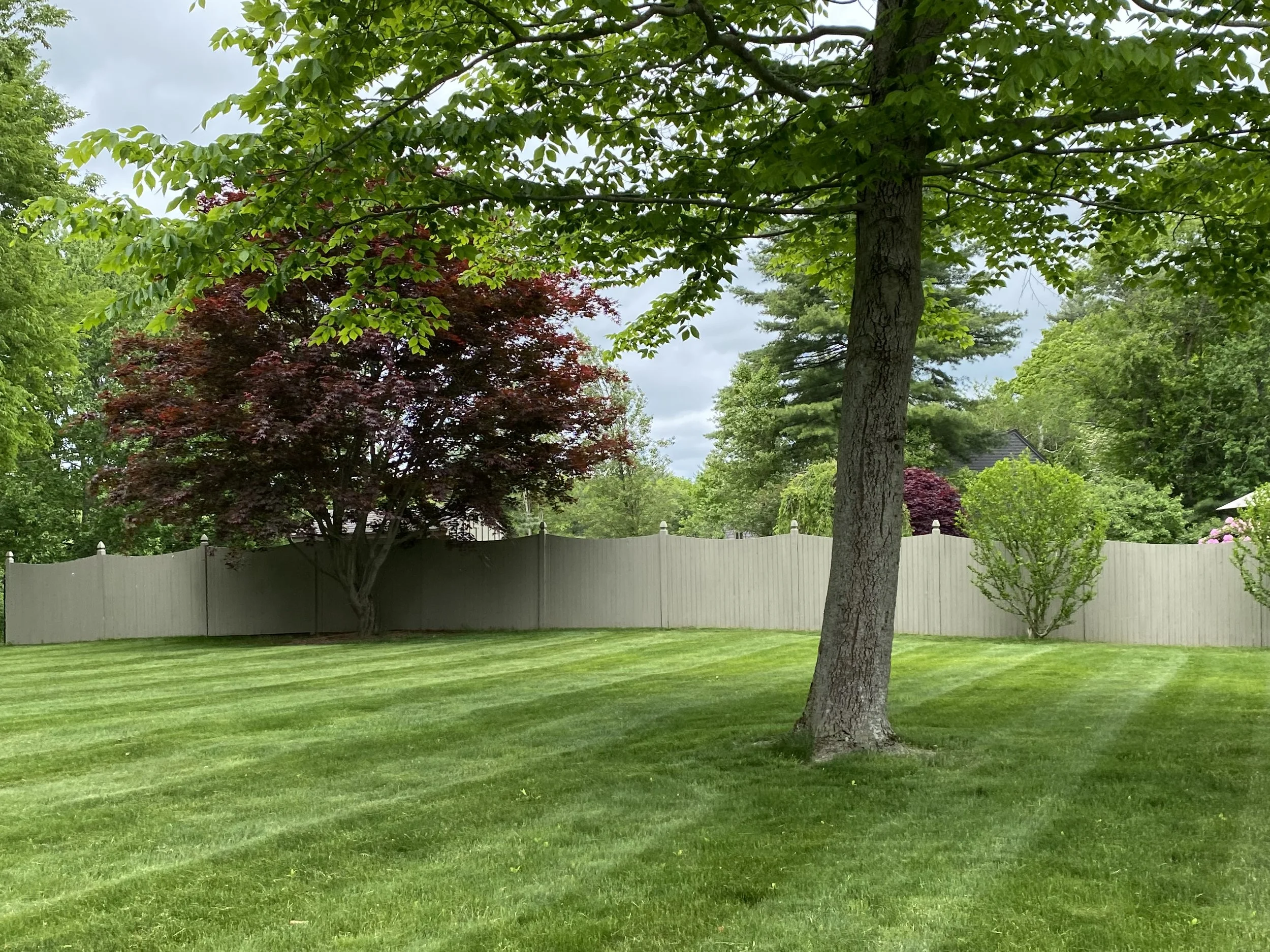 Backyard with green lawn, trees, and a wooden fence.