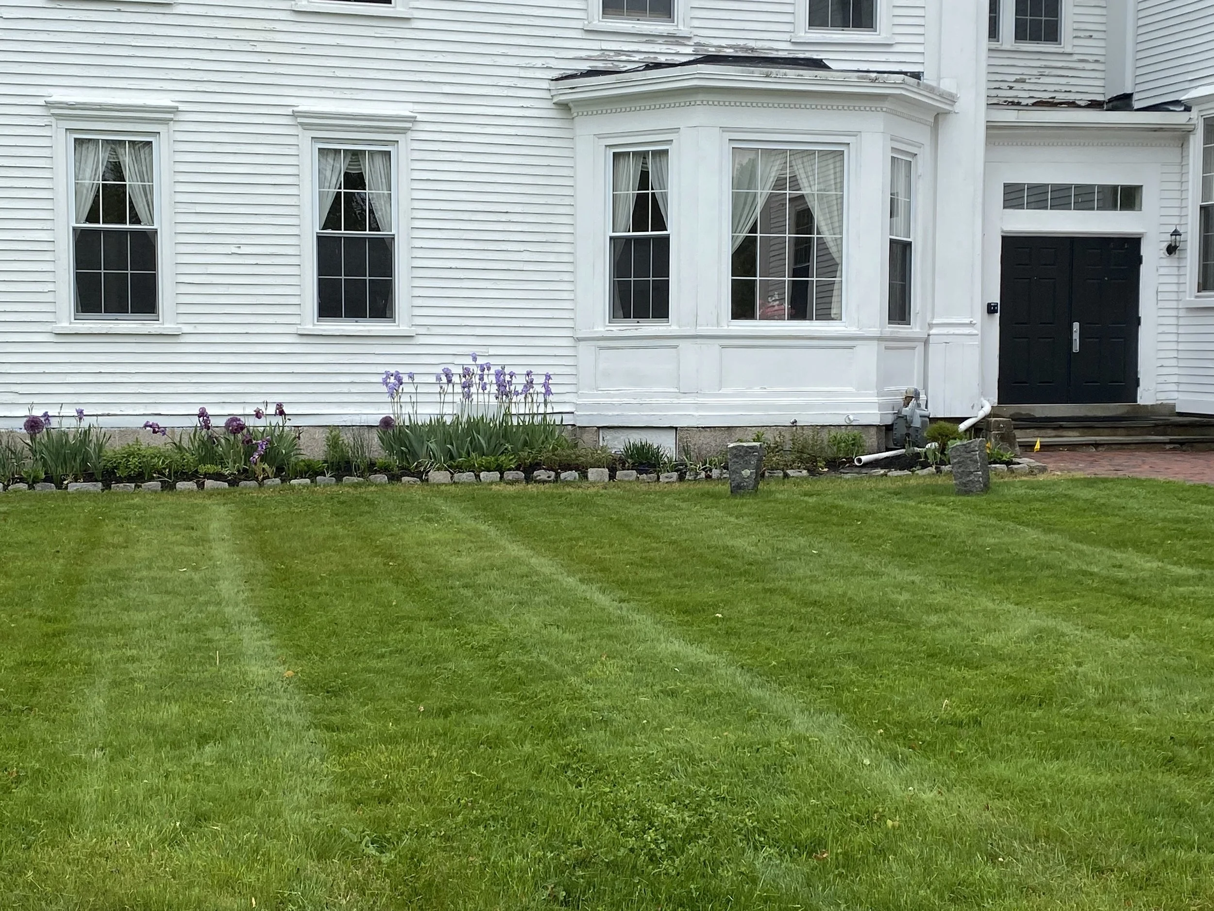 White house with adjoining garage, fronted by a neatly mowed lawn and a flower bed with purple flowers.