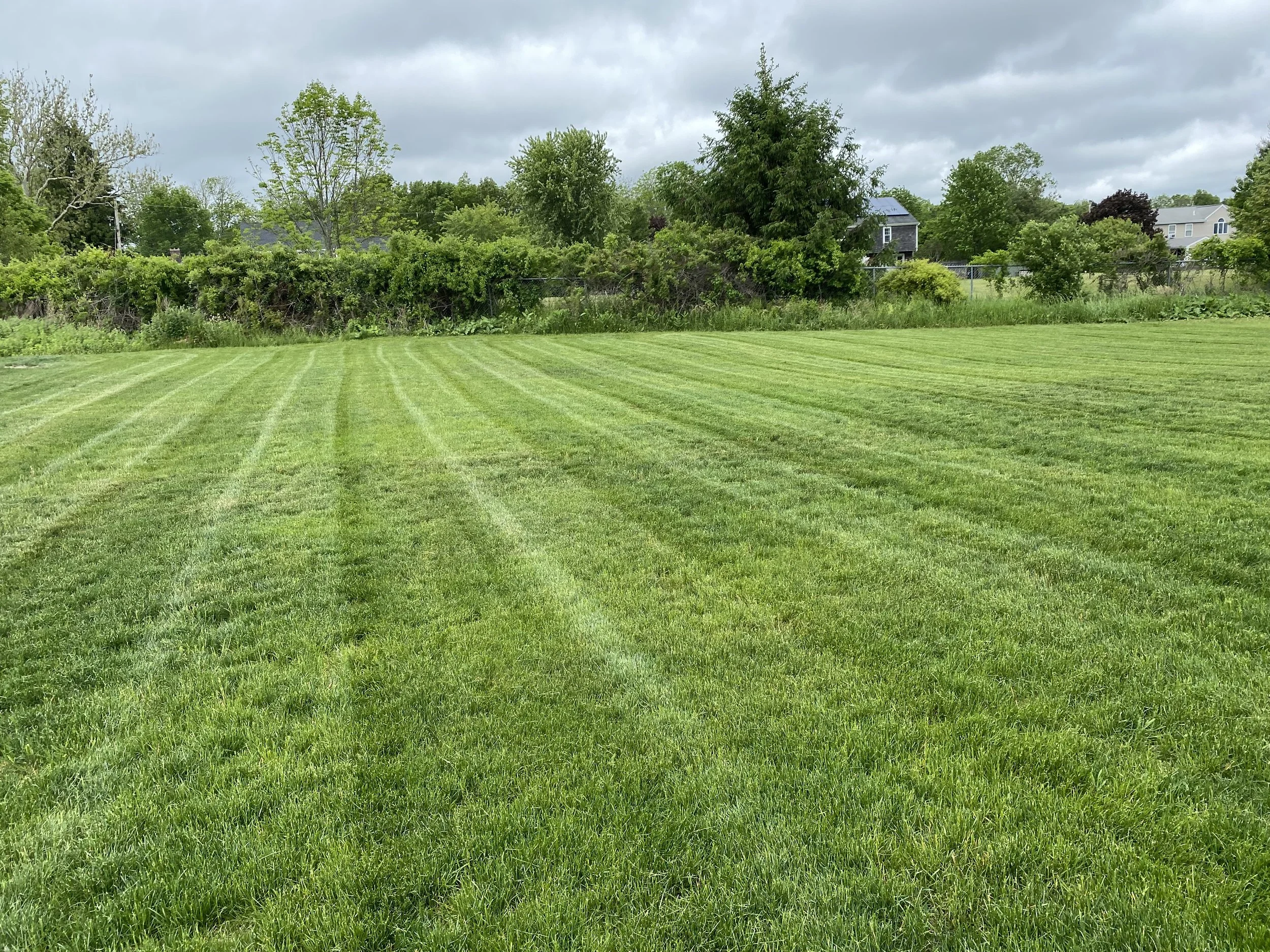 Freshly mowed grassy field with striped patterns, surrounded by trees and shrubs, under a cloudy sky.